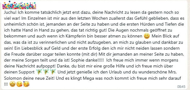 "Ich durfte eine sehr bereichernde und lehrreiche Session mit Sophie erleben. Mit viel Feingefühl und Klarheit hat sie mir neue Perspektiven und Denkansätze eröffnet, wie ich konkrete Themen gezielt angehen und herausfordernde Situationen zu meinem Vorteil gestalten kann, immer mit Blick auf nachhaltigen Erfolg. Sophie strahlt eine ruhige, vertrauensvolle Präsenz aus, bei der man sich sofort gut aufgehoben fühlt. Ich freue mich schon jetzt auf die nächsten Gespräche und die gemeinsame Weiterentwicklung."